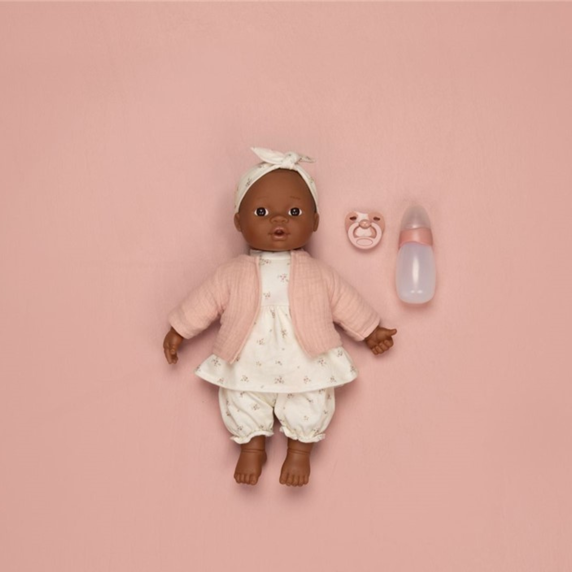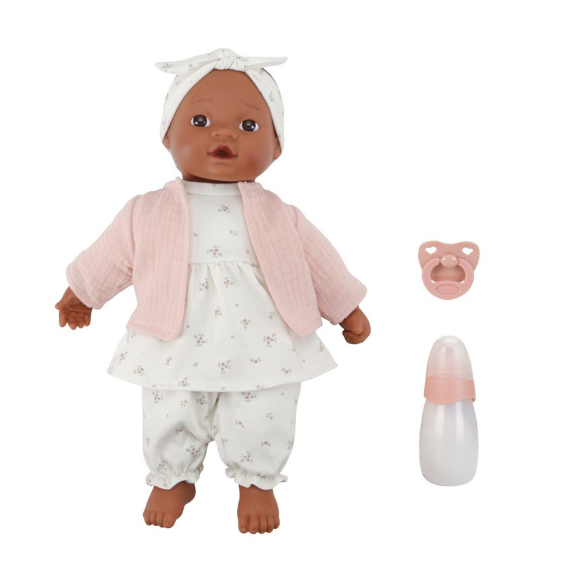 La muñeca Noa es una compañera perfecta para que los niños exploren el juego simbólico y el cuidado. Con un cuerpo suave y realista, invita al contacto tierno y a desarrollar habilidades emocionales. Vestida con prendas de la colección White Meadows —diadema, vestido, pantalones y chaleco rosa—, cambiar su ropa fomenta la motricidad fina. Además, el chupete y el biberón permiten recrear momentos de alimentación y consuelo, enriqueciendo la experiencia de juego y fortaleciendo la capacidad de empatía y responsabilidad en los más pequeños.