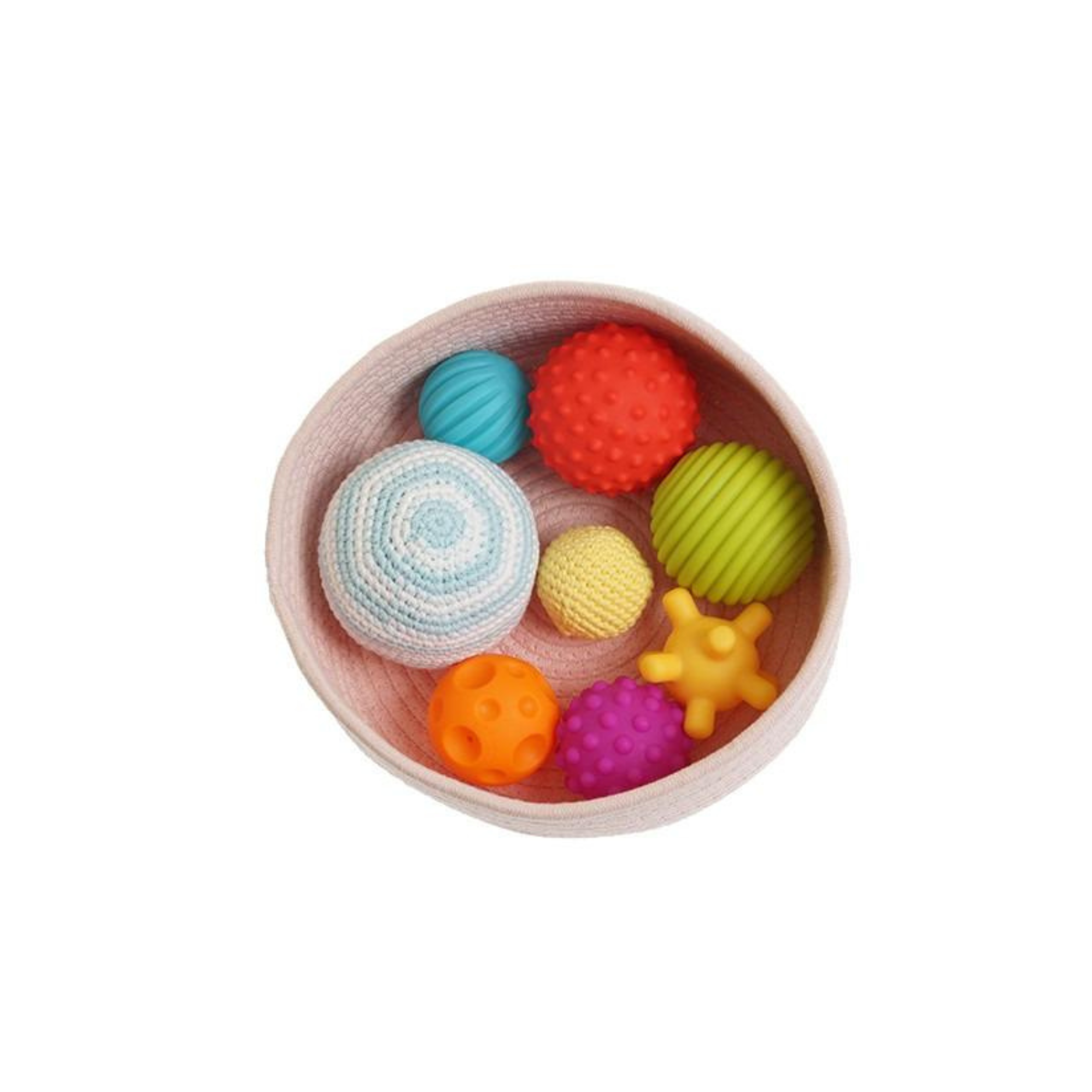 La cesta tejida facilita la exploración, el almacenamiento y el juego de “meter y sacar”, una actividad esencial en el desarrollo temprano. Cada pelota ofrece una experiencia sensorial distinta, permitiendo al niño experimentar presiones, relieves, suavidad y niveles de firmeza.
