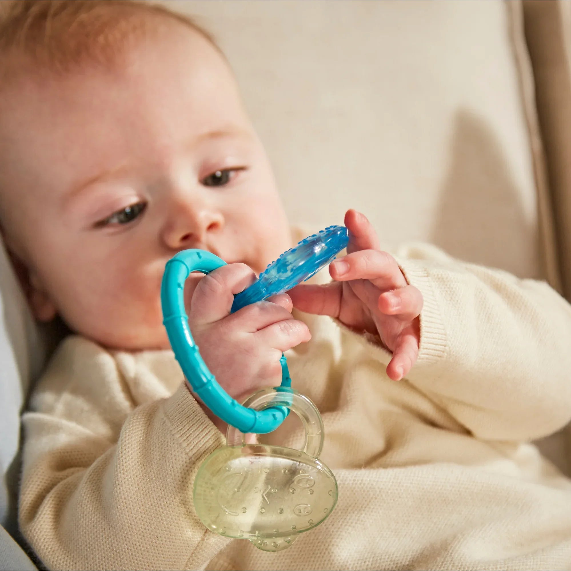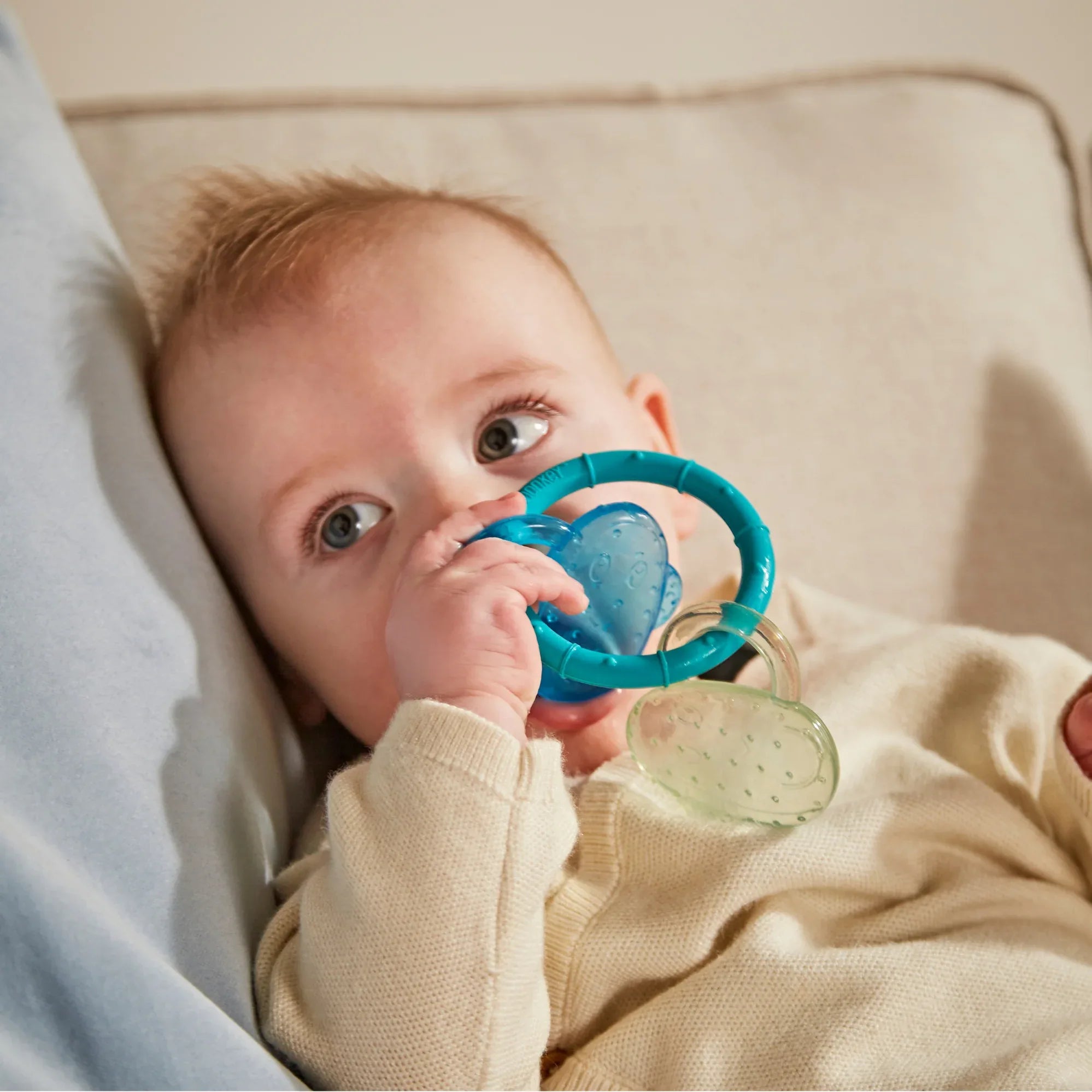 A teether designed for babies 3 months and older with a dual function: soothing sore gums and providing sensory stimulation. Its water-filled sides freeze in the refrigerator to provide a cooling sensation that calms the natural inflammation of teething. Made with BioCote® antimicrobial technology that reduces up to 99.99% of microbes, ensuring continuous protection against bacteria such as E. coli and MRSA. BPA-free and FDA-approved, its ergonomic and lightweight shape allows little hands to easily grasp it. A practical and safe solution for your baby's well-being during this time.
