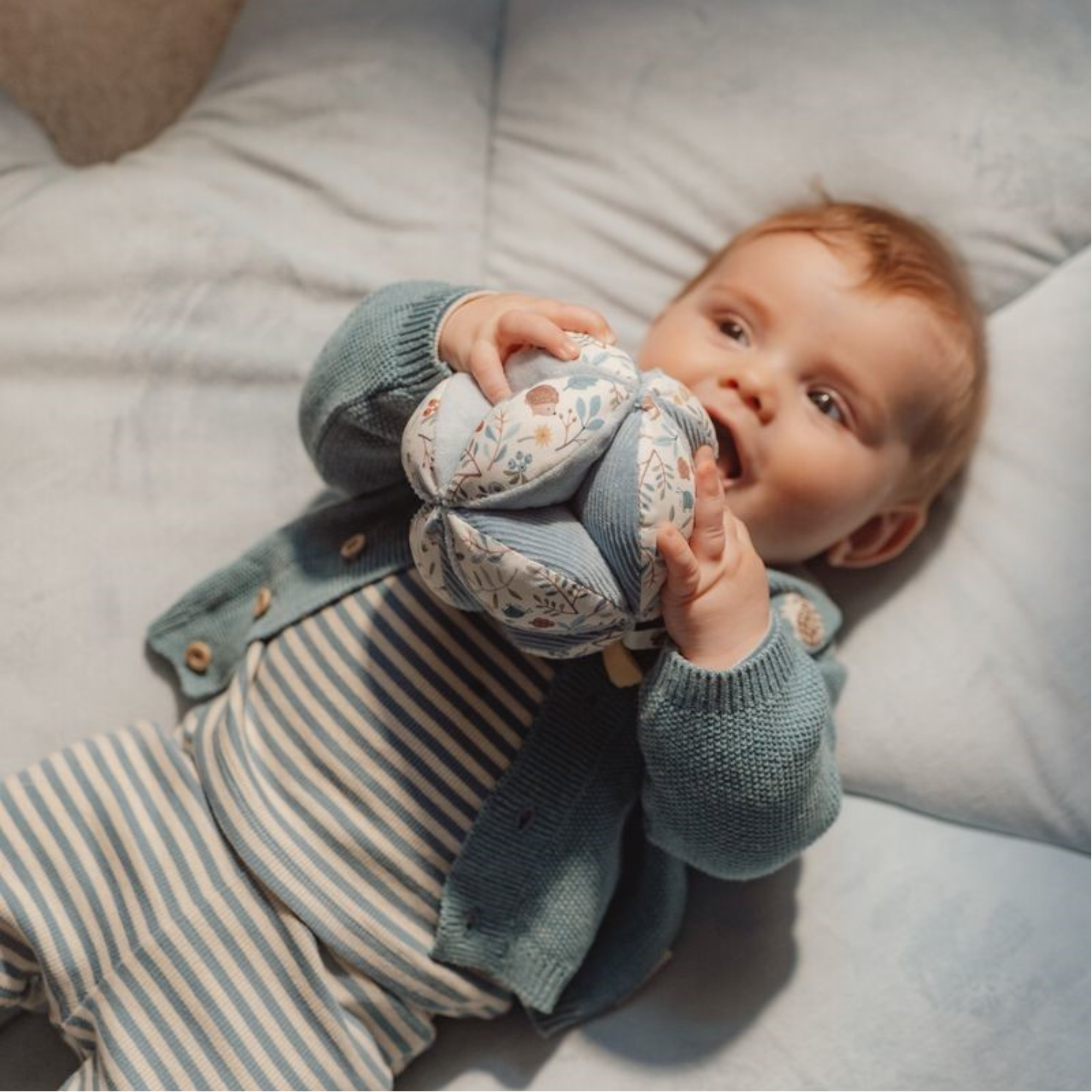 Pelota de agarre diseñada para estimular el desarrollo sensorial de tu bebé. Con múltiples texturas, patrones y nudos estratégicamente distribuidos, ofrece diversos puntos de apoyo perfectos para pequeñas manos en desarrollo. El sonajero integrado produce un sonido suave que incentiva la exploración activa, mientras que las etiquetas de diferentes materiales enriquecen la experiencia táctil. Inspirada en la pedagogía Montessori, esta pelota Forest Friends combina funcionalidad y seguridad, promoviendo el agarre, la coordinación motora y la curiosidad natural del bebé desde