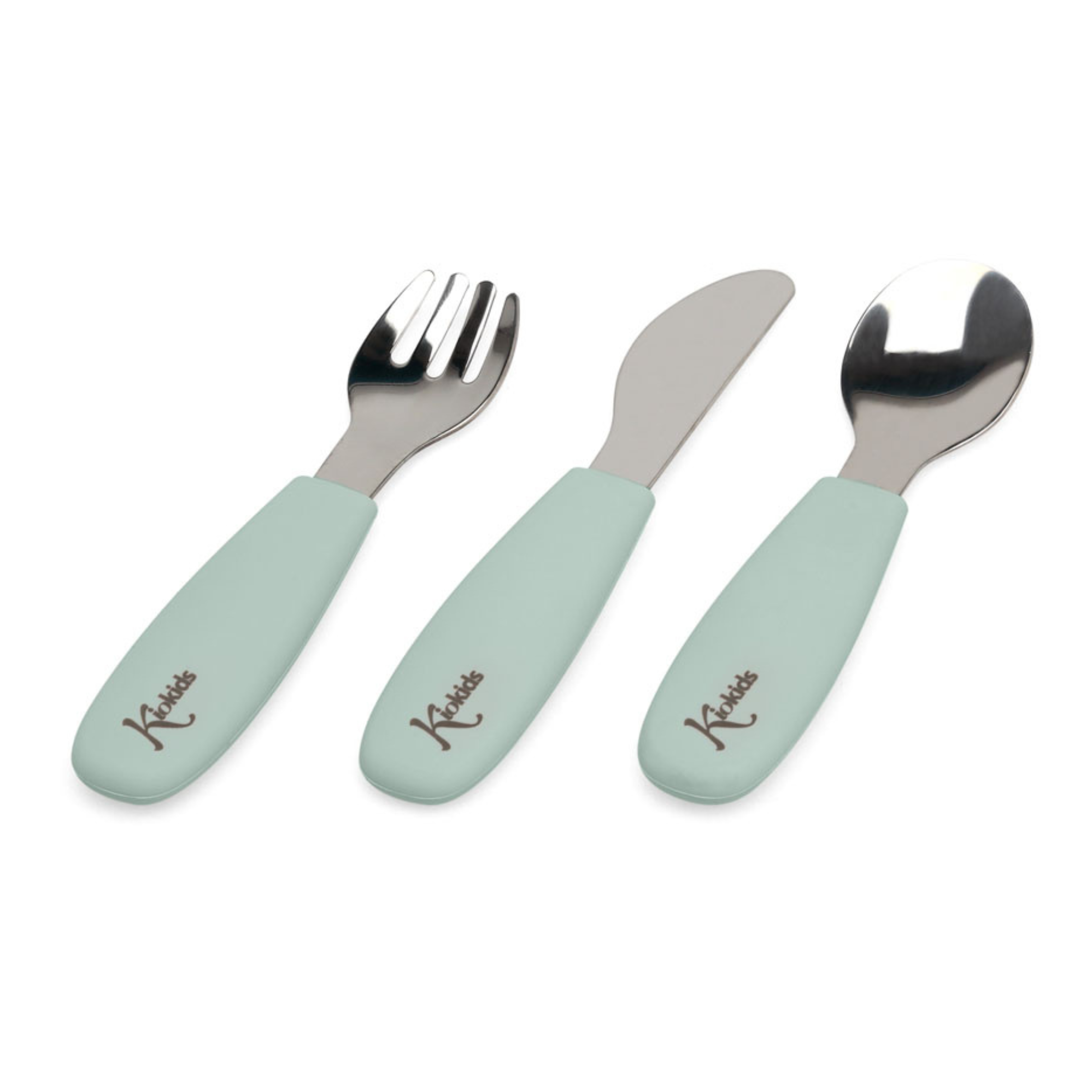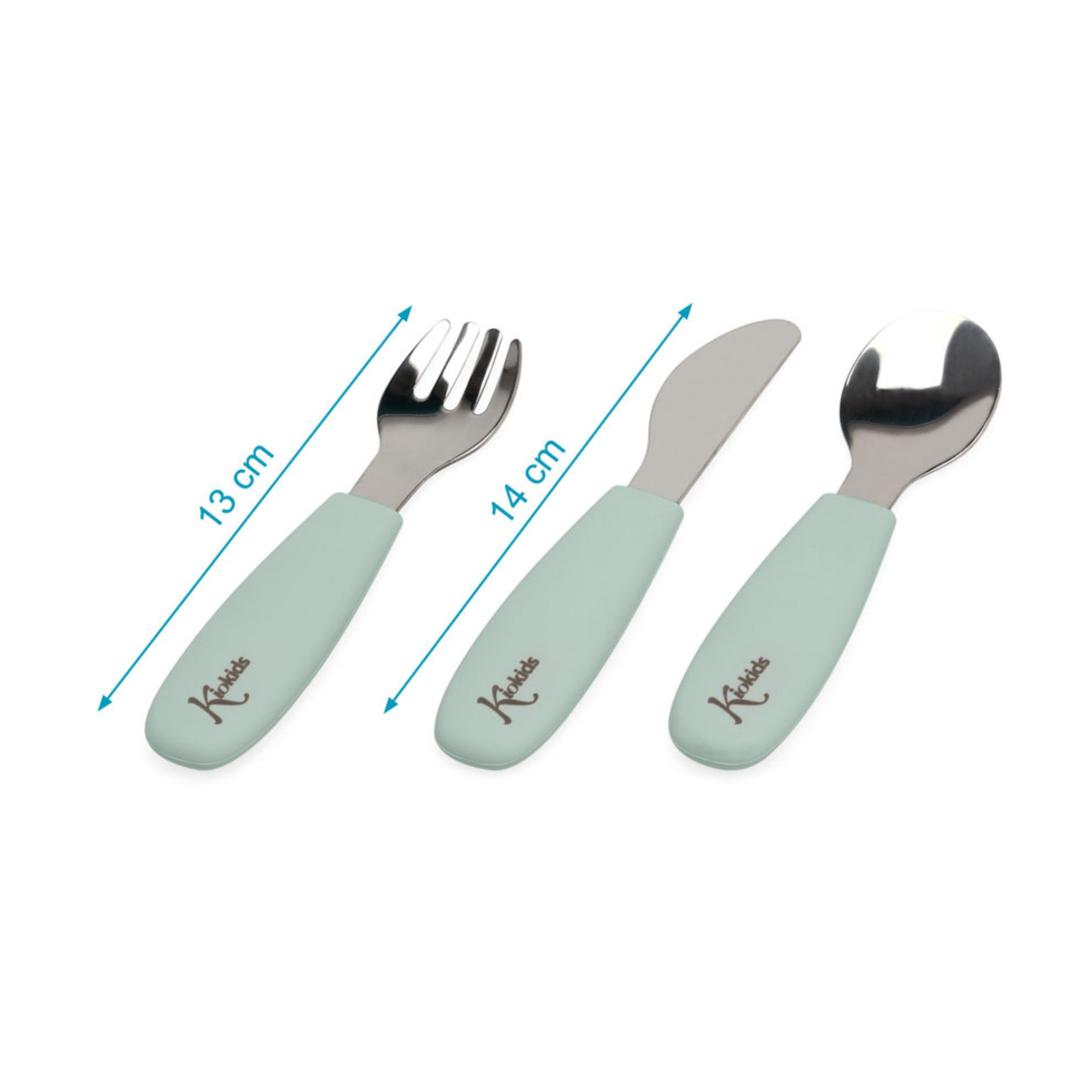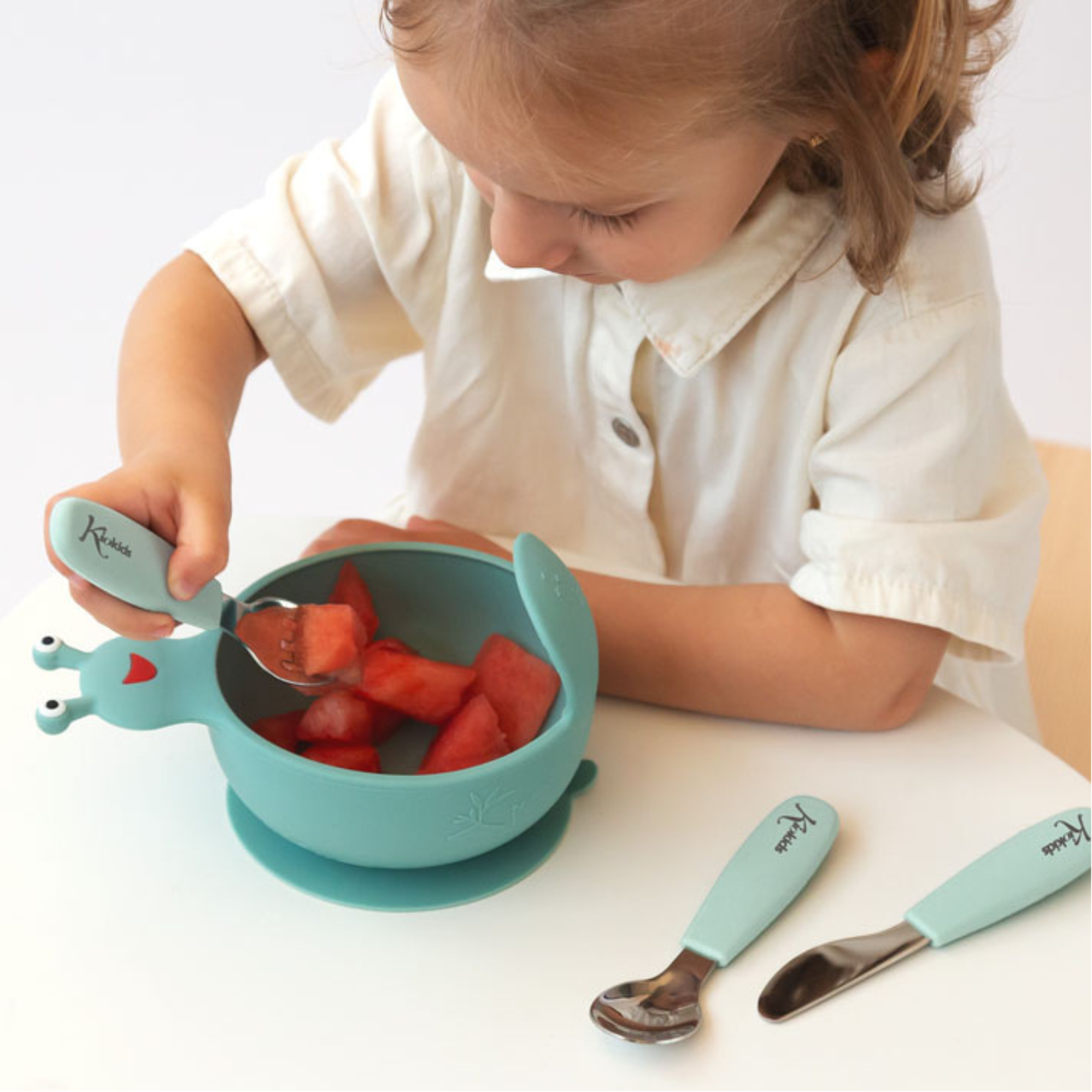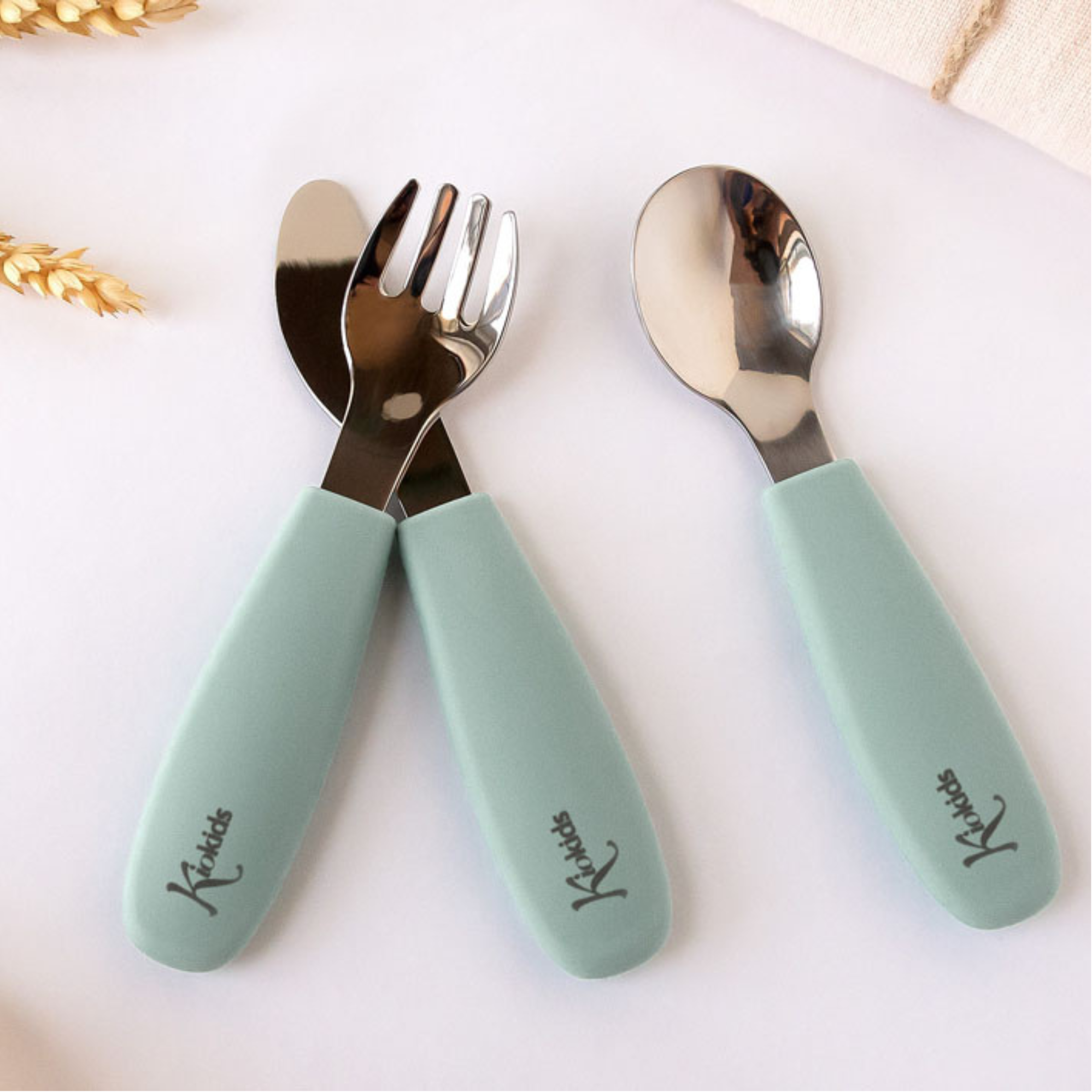 Ensemble de couverts pour enfants en acier inoxydable 304 et silicone alimentaire. Manche ergonomique et antidérapant adapté aux petites mains, avec bords arrondis pour une sécurité optimale.