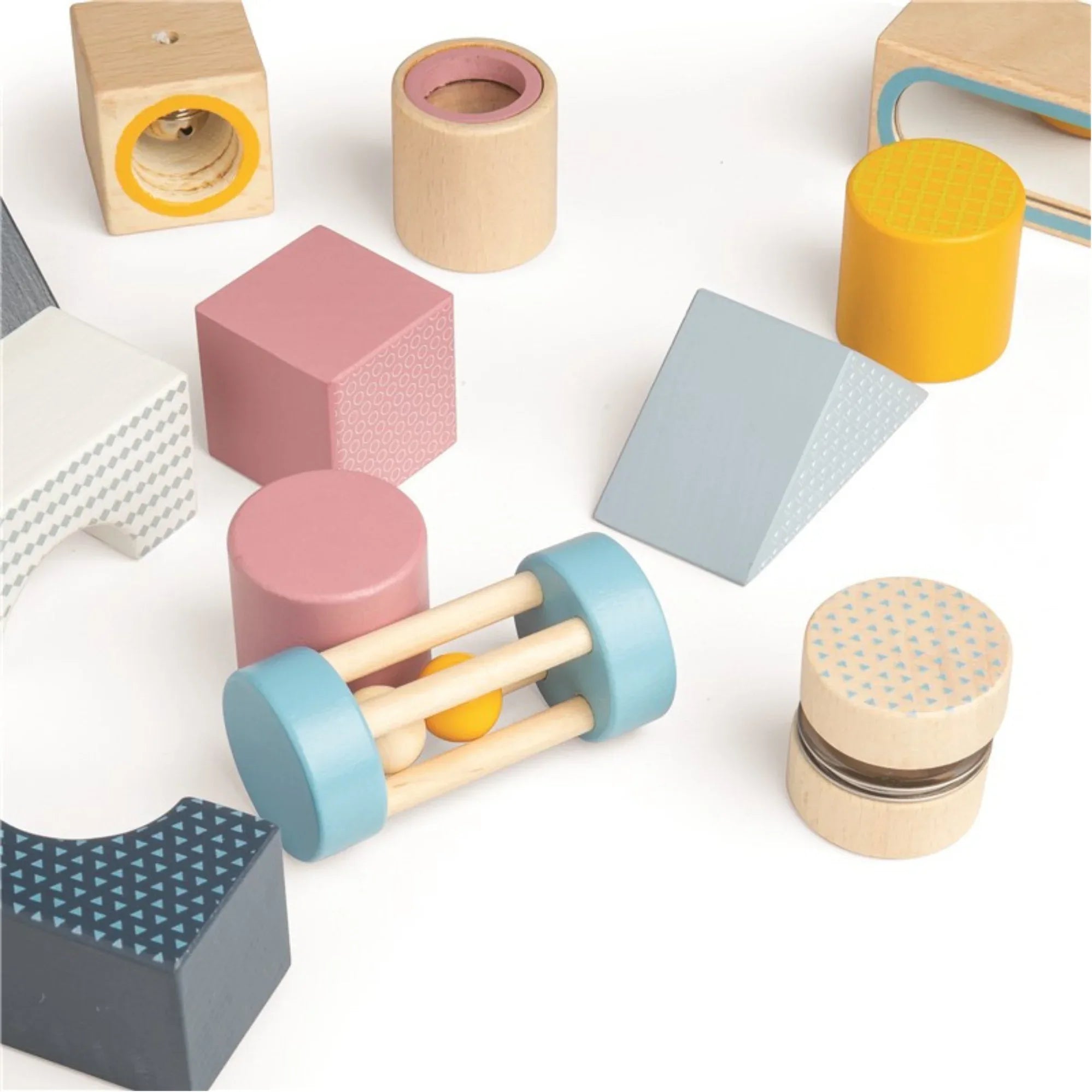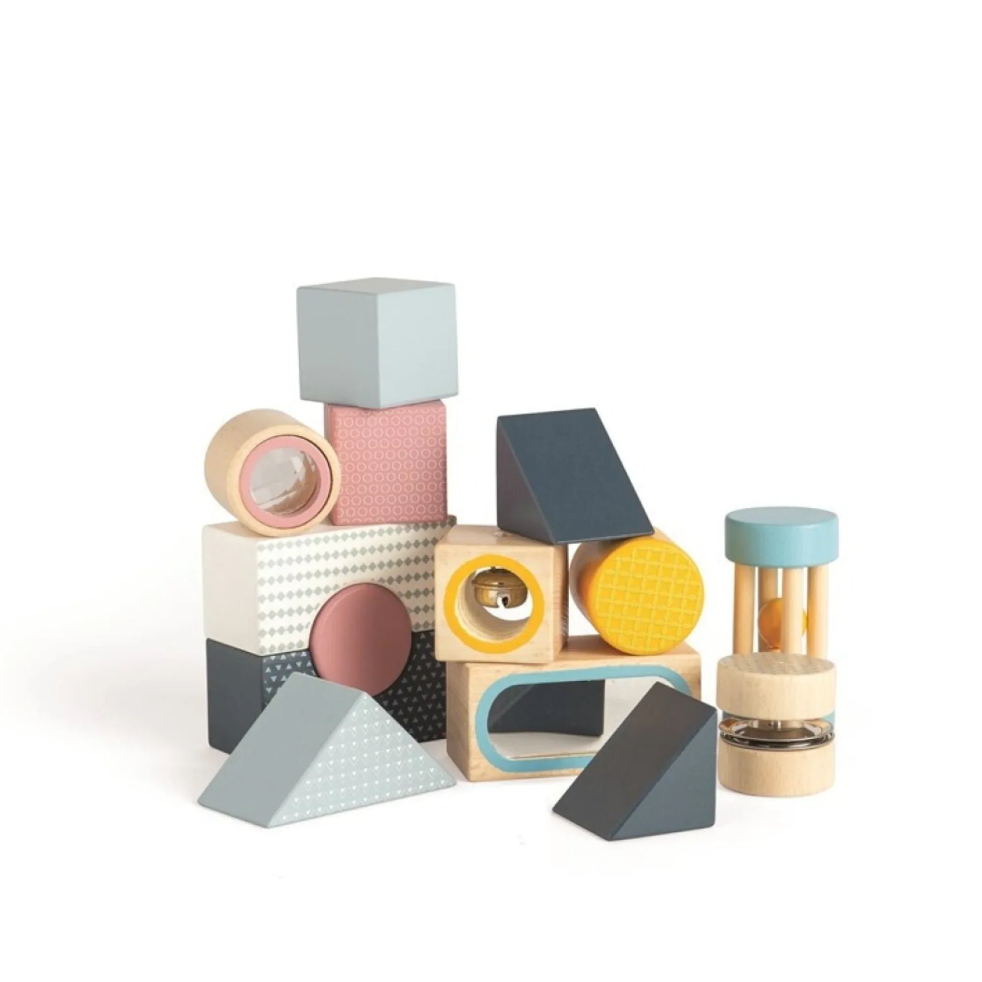 Set di blocchi sensoriali in legno con diverse forme, texture, suoni ed elementi interattivi come uno specchio e un sonaglio. Progettato per stimolare lo sviluppo precoce attraverso il gioco libero e la costruzione creativa.