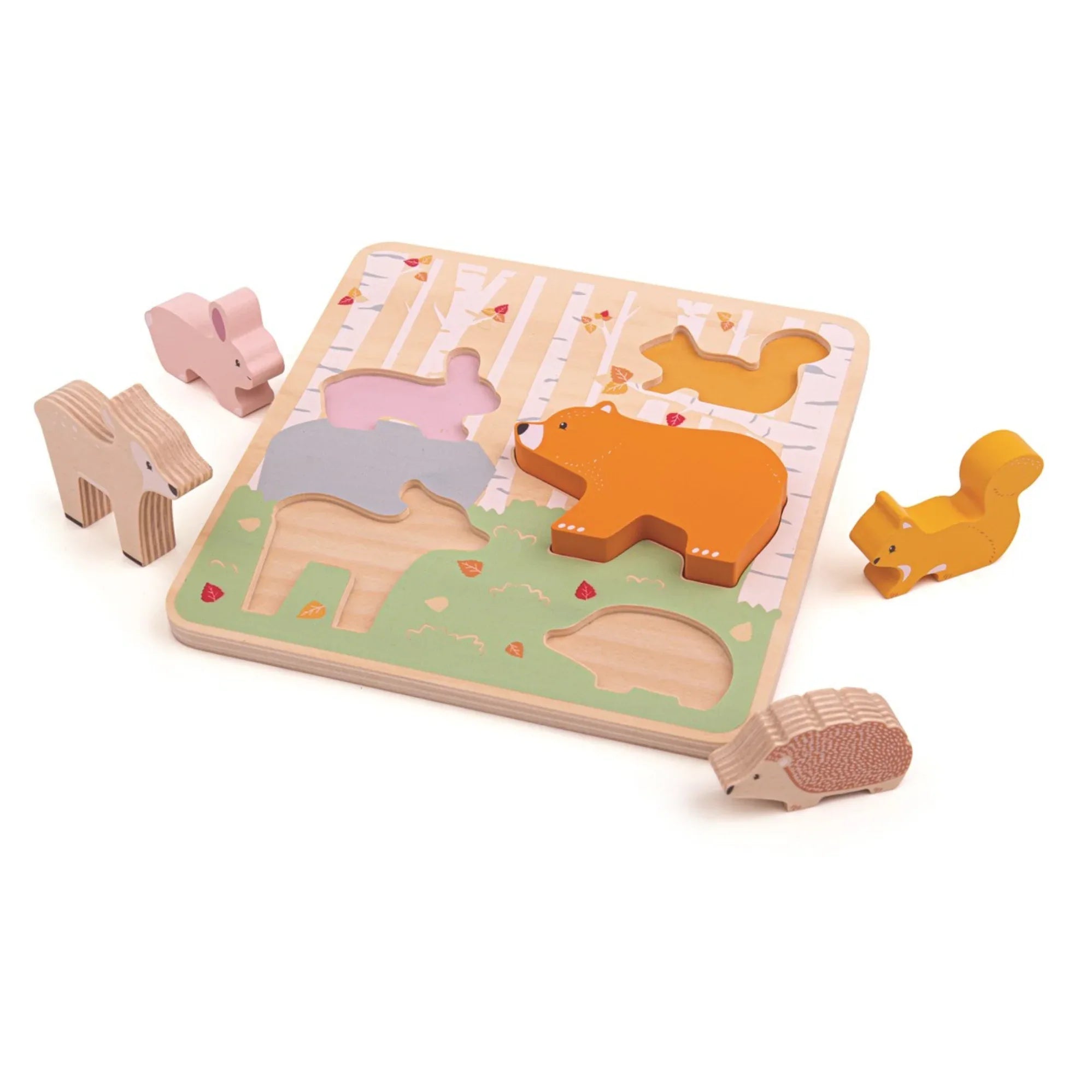 Puzzle in legno raffigurante animali del bosco (orso, volpe, cervo, coniglio e riccio), ideale per i più piccoli. I suoi pezzi spessi e facili da impugnare aiutano a sviluppare la motricità fine, la coordinazione occhio-mano e il riconoscimento delle forme .