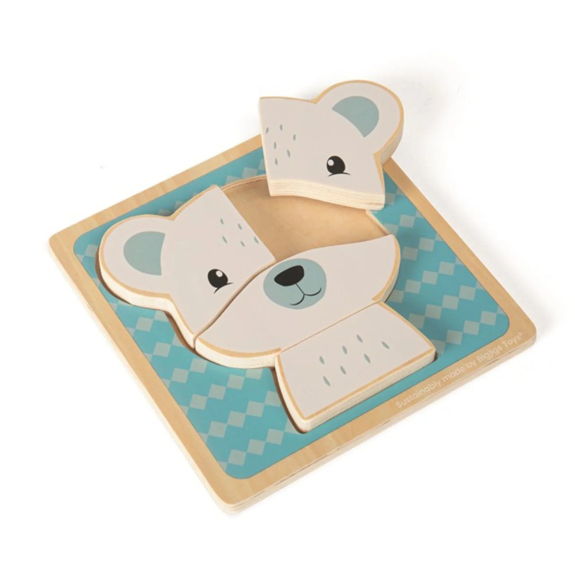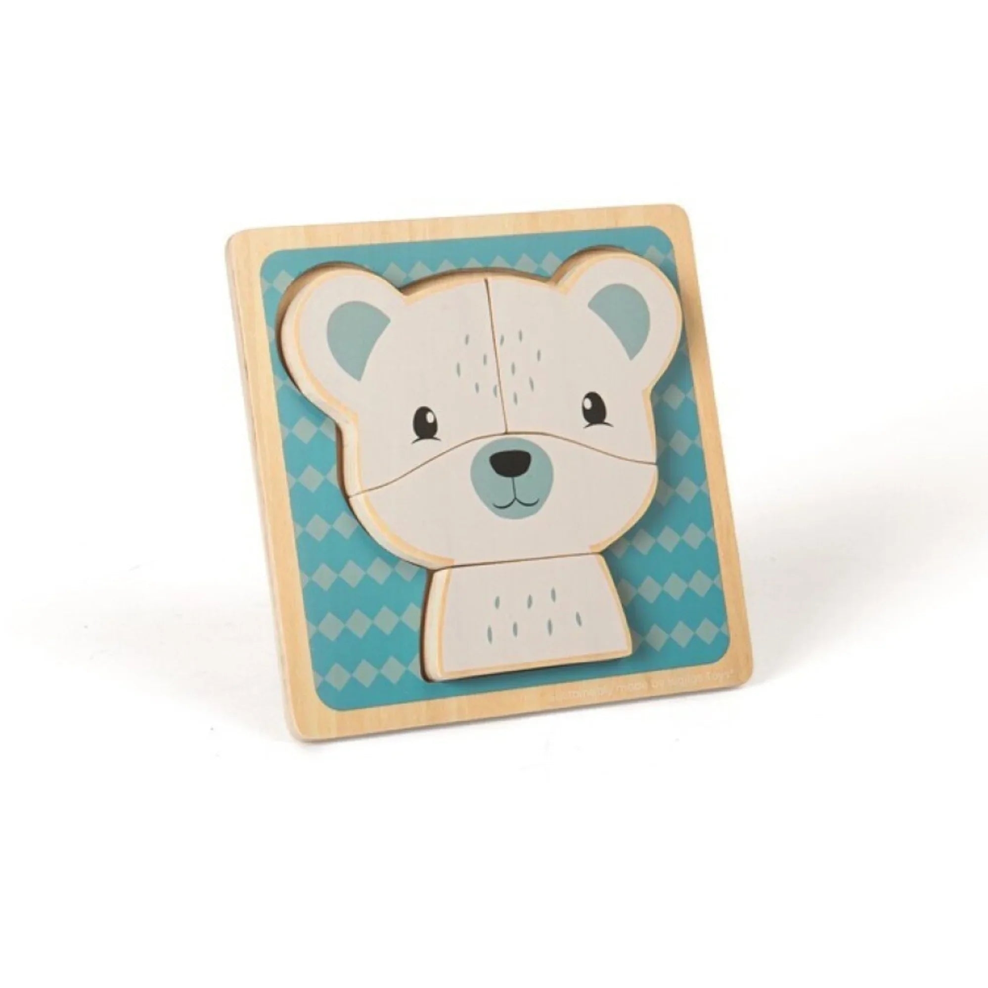 Grazioso puzzle in legno per bambini con un orso polare, composto da pezzi spessi e facili da afferrare per le manine dei più piccoli. Ideale per stimolare la motricità fine, la coordinazione occhio-mano e il riconoscimento delle forme, mentre i bambini si divertono a incastrare i pezzi.