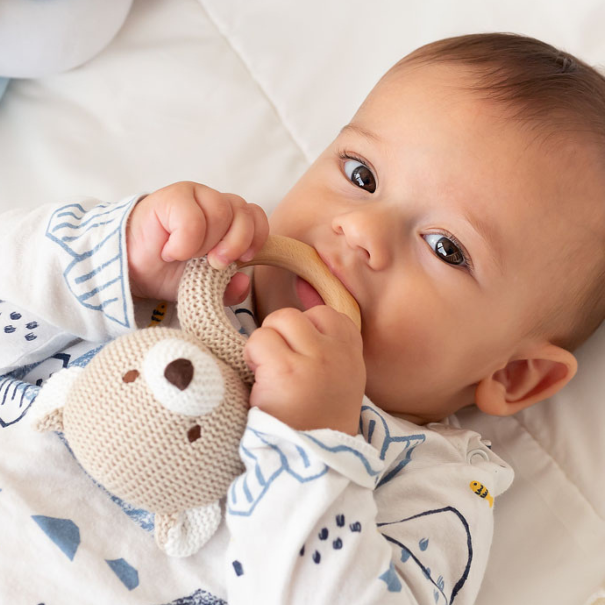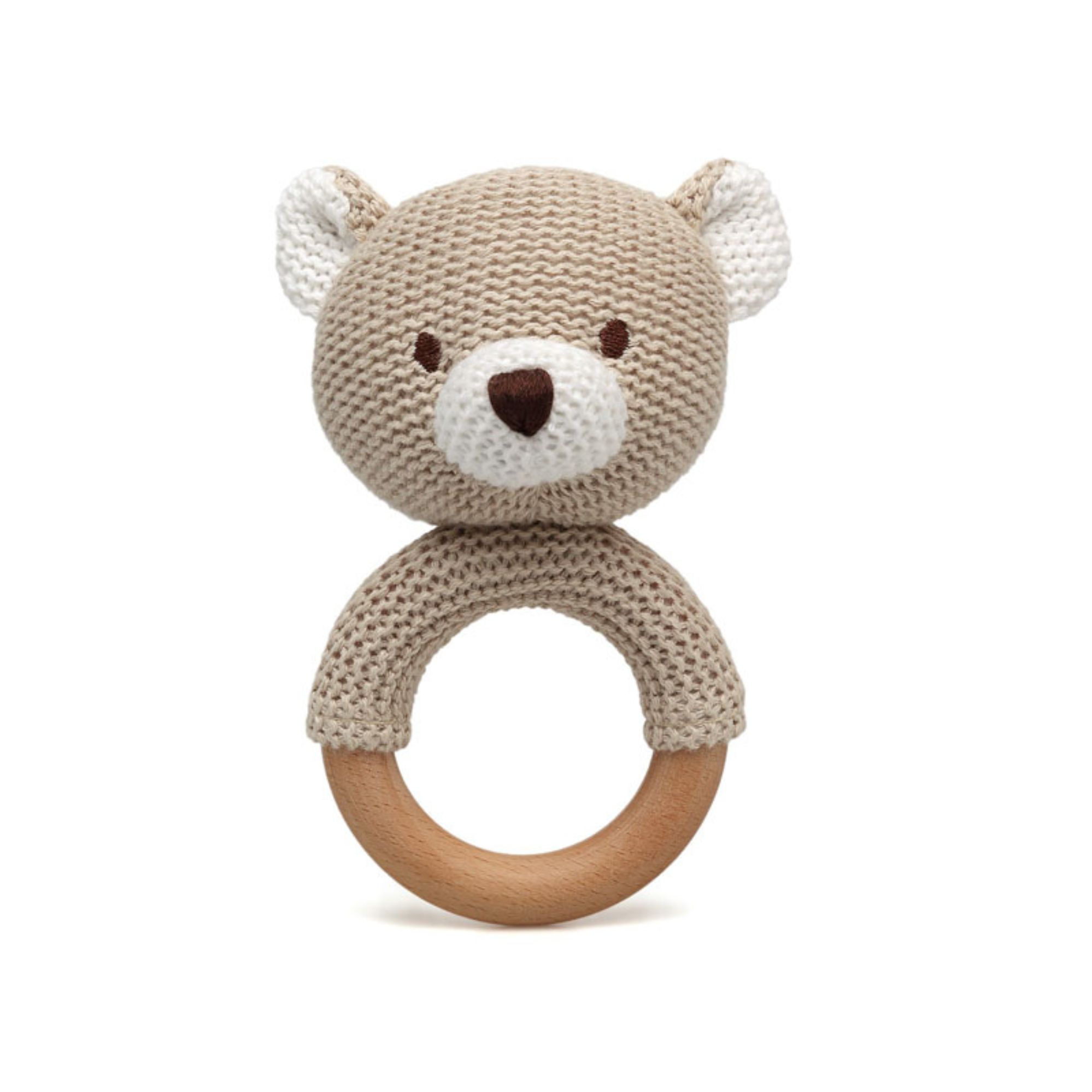 Todos los juguetes están testados para menores de 3 años, por lo que son totalmente seguros. Con sus diseños adorables y colores suaves, esta colección ecofriendly es perfecta para los más pequeños. Este modelo es un mordedor de madera de haya con forma de osito beige.
