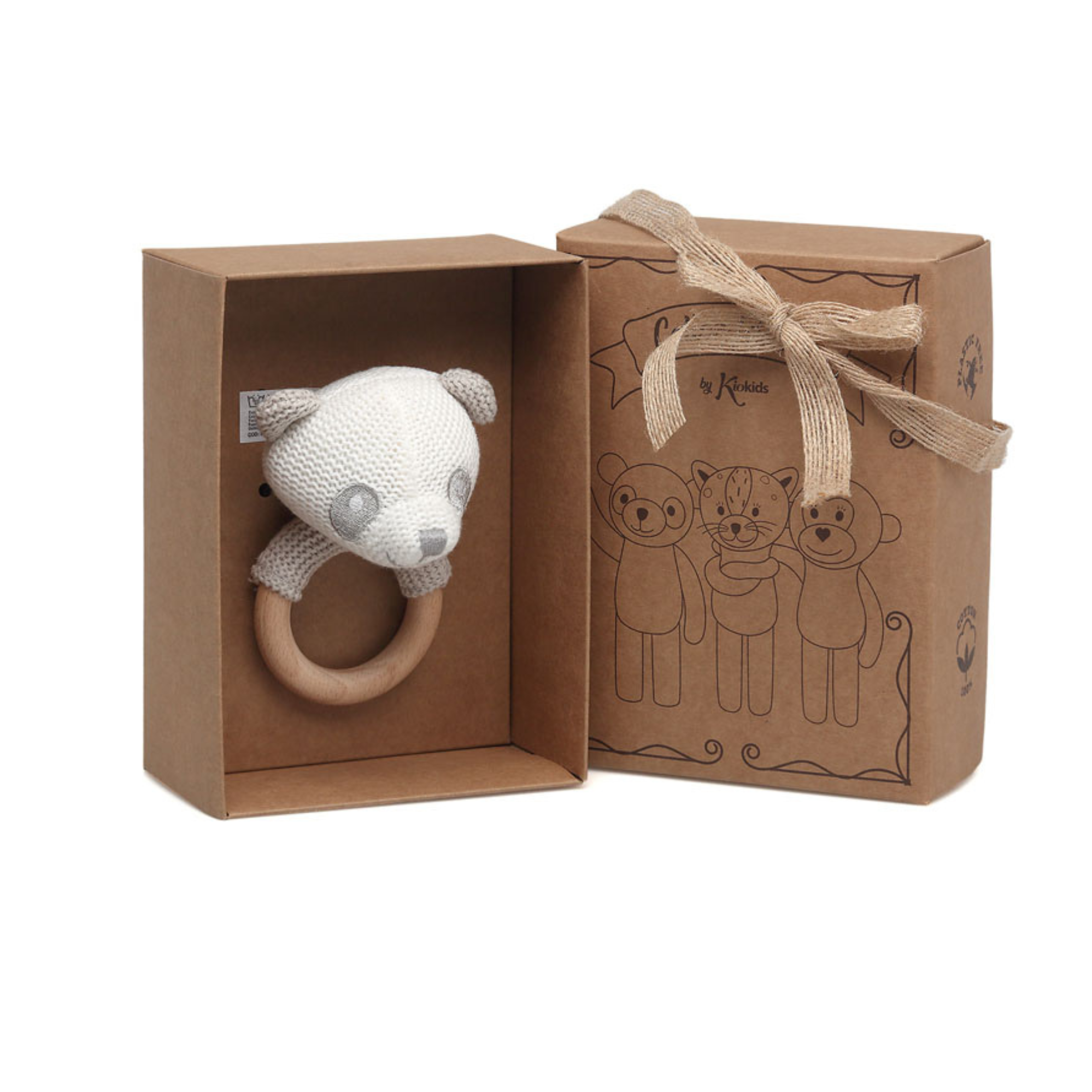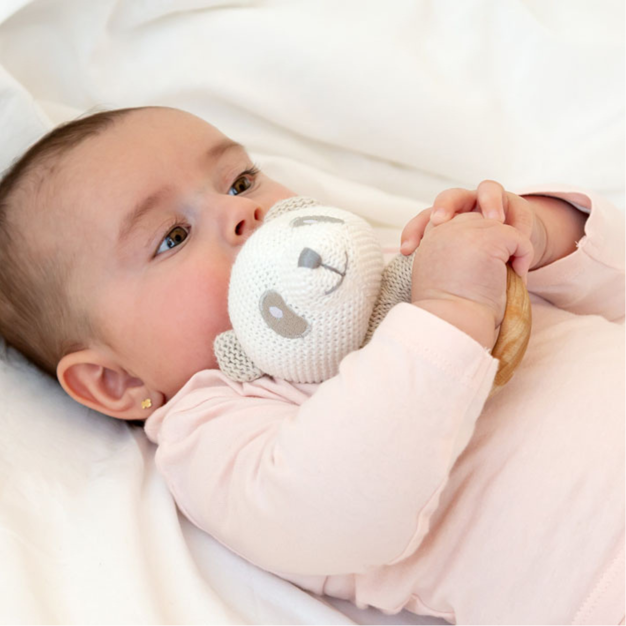 Este modelo es un mordedor de madera de haya con cabecita de osito beige.
